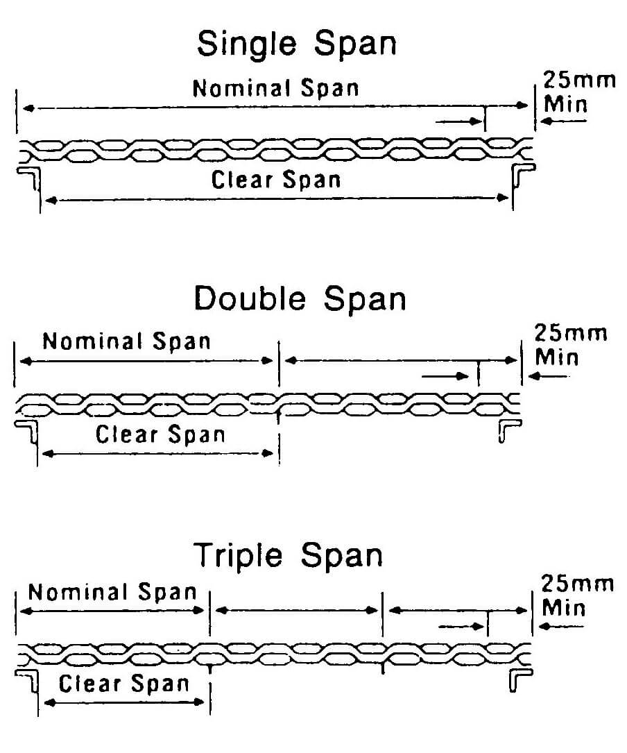 | Assumption | ![]() | Note : 1. Load capacities given in the table are heaviest loads that will cause no permanent deformation with safety factor of 1.4 times. If some permanent deformation is allowed load can be increased by 40%. 2.The load table is appilcable base on spanning in LWM direction and spot-weld at every fourth strand on support and minimum 25mm landing on both ends. 3.Spanning recommended based on assumption that deflection is not greater than span / 200. 4.Spanning stated in the table are nominal. Clear spans are obtained by deducting 25 mm landing on both ends. |